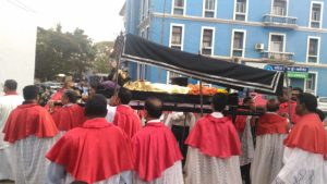 A procissão prossegue então pelas ruas Mahatma Gandhi e Dr. Domingos Roque de Sousa, passando pelo Jardim Garcia de Orta, até ao largo da igreja. Ao pé da escadaria, Jesus encontra sua Mãe, Maria (Figura 2). Entristecida pelo seu Divino Filho ter sido tão injustamente acusado e obrigado a carregar a cruz até à morte, ela acompanha-o nos seus últimos passos, como fez no Gólgota há dois mil anos.